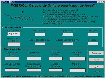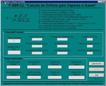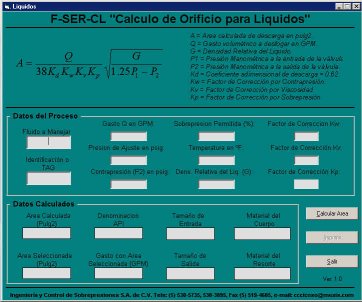 ![]() El programa es muy fácil de utilizar y es de apoyo para el cálculo de orificios para válvulas de vapores, gases y líquidos. Solamente hay que llenar los camps con los datos requeridos, sin embargo para una mejor asistencia técnica recomendamos el contacto directo con el departamento de soporte técnico de nuestra empresa.